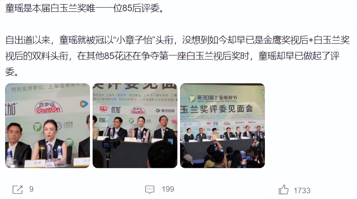 当时很多网友都忍不住问:“凭什么?”在2019年的时候,童瑶就凭借《大江大河》获得白玉兰奖最佳女配角,2020年凭借《三十而已》获得白玉兰最佳女主角,而她成为评委绝对是实力的一种体现。